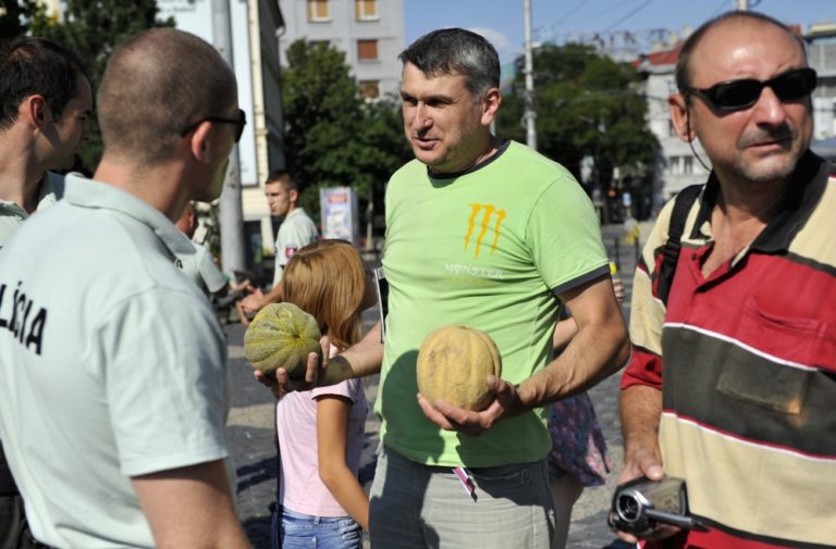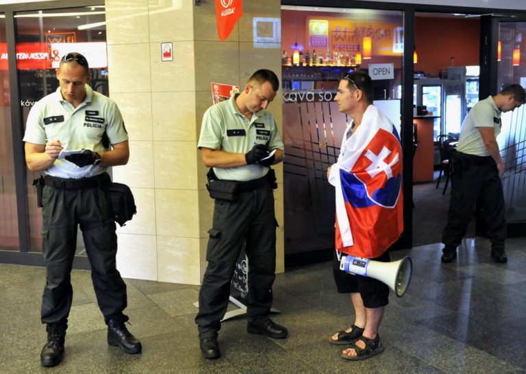 Polícia skontrolovala doklady niektorých účastníkov protestu s názvom Spoločne za slušný a bezpečný život na Slovensku 5 - proti skorumpovaným politikom a asociálom, pred Prezidentským palácom. Verejné zhromaždenie organizovalo občianske združenie Ľudia v ohrození. Bratislava, 19. júl 2014. Foto: SITA/Ján Slovák