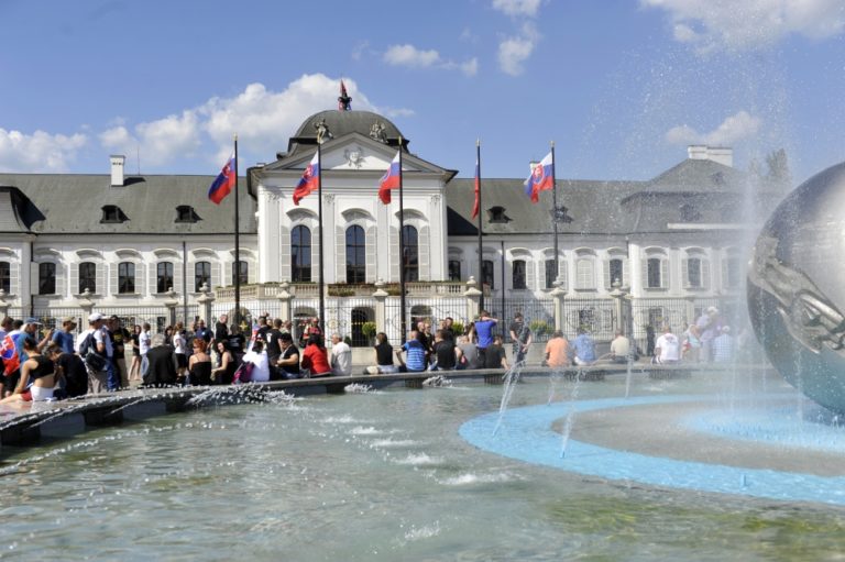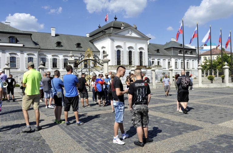 Niekoľko desiatok účastníkov protestu s názvom Spoločne za slušný a bezpečný život na Slovensku 5 - proti skorumpovaným politikom a asociálom, pred Prezidentským palácom. Verejné zhromaždenie organizovalo občianske združenie Ľudia v ohrození. Bratislava, 19. júl 2014. Foto: SITA/Ján Slovák