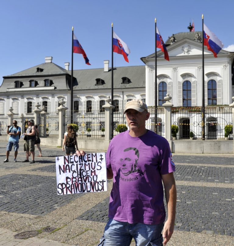 Účastník protestu s názvom Spoločne za slušný a bezpečný život na Slovensku 5 - proti skorumpovaným politikom a asociálom, pred Prezidentským palácom. Verejné zhromaždenie organizovalo občianske združenie Ľudia v ohrození. Bratislava, 19. júl 2014. Foto: SITA/Ján Slovák