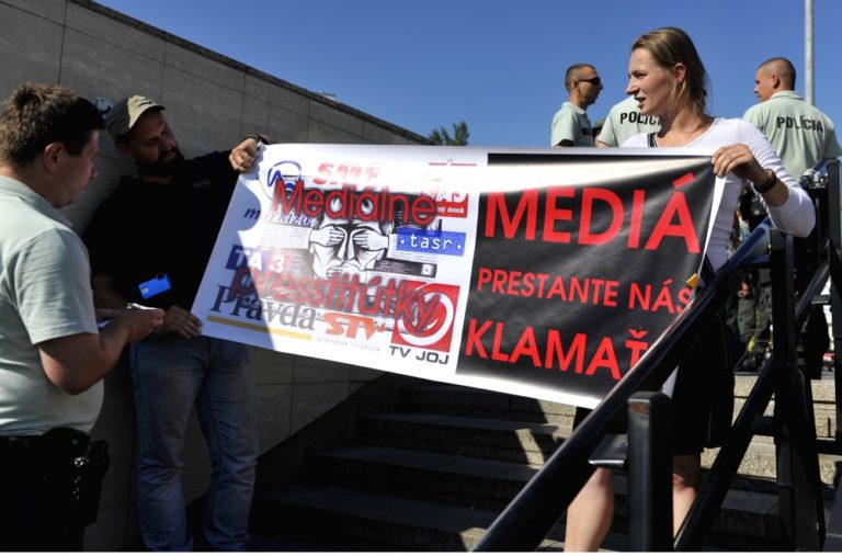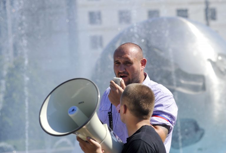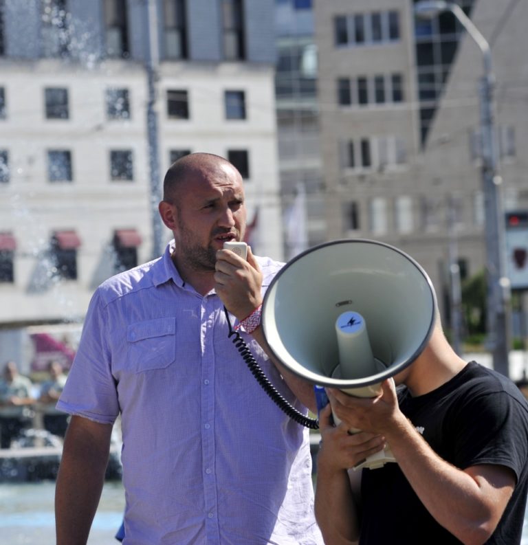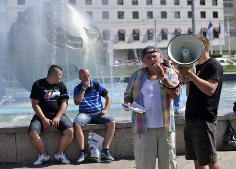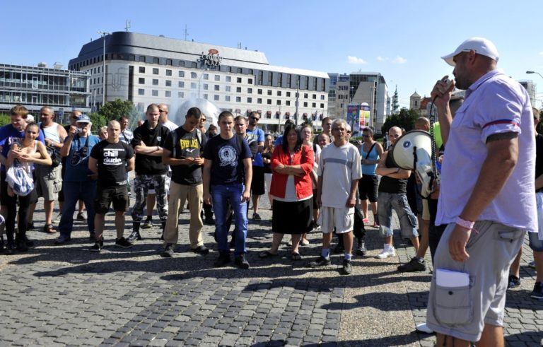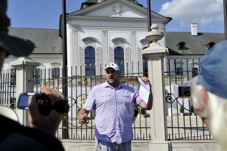 Ohlasovateľ protestu Marián Magát (vľavo) z 'Akčnej skupiny Vzdor' počas prejavu k niekoľkým desiatkam účastníkov protestu s názvom Spoločne za slušný a bezpečný život na Slovensku 5 - proti skorumpovaným politikom a asociálom, pred Prezidentským palácom. Verejné zhromaždenie organizovalo občianske združenie Ľudia v ohrození. Bratislava, 19. júl 2014. Foto: SITA/Ján Slovák
