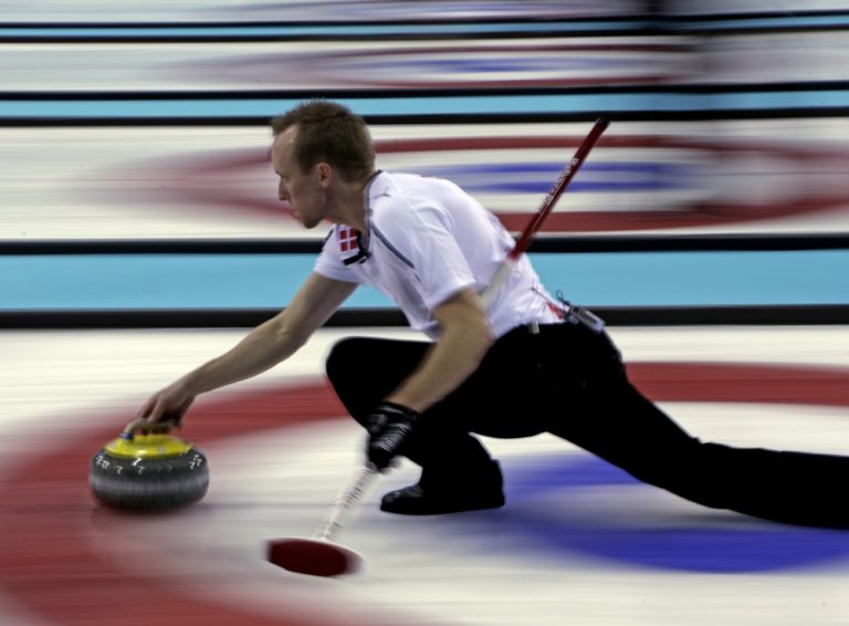 Dánsky reprezentant v curlingu Mikkel Poulsen počas pondelňajšieho zápasu proti Nórsku na olympijskom turnaji v Soči. Foto: SITA/AP