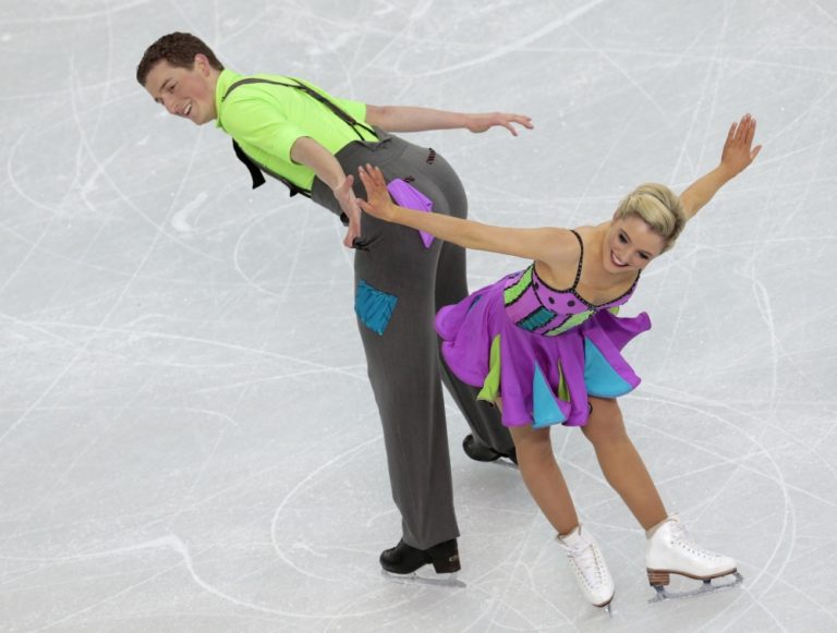 Litovský reprezentanti Isabella Tobiasová a Deividas Stagniunas počas súťaže vo voľných tancoch na ľade. Foto: SITA/AP