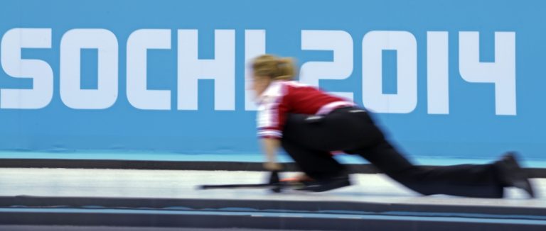 Ruská reprezentantka v curlingu Margarita Fominová počas pondelňajšieho zápasu proti Veľkej Británii na olympijskom turnaji v Soči. Foto: SITA/AP
