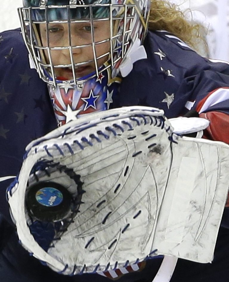 Americká brankárka Jessie Vetterová chytá puk do lapačky počas semifinálového zápasu na olympijskom turnaji v Soči proti Švédkam. Foto: SITA/AP