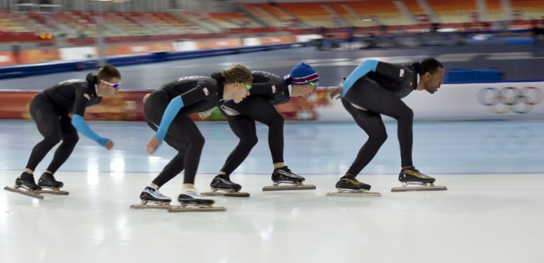Zľava: Americkí rýchlokorčuliari Joey Mantia, Brian Hansen, Jonathan Kuck a Shani Davis počas tréningu v Adler aréne. Foto: SITA/AP