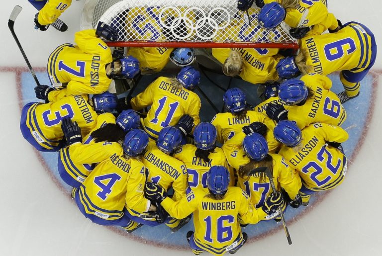 Švédske hokejové reprezentantky pred pondelňajším semifinálovým zápasom olympijského turnaja proti Američankám. Foto: SITA/AP