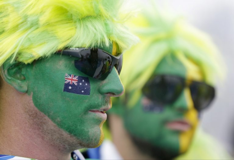 Fanúšikovia z Austrálie čakajú na štart pretekov v snoubordkrose mužov v parku extrémnych športov Roza Chutor. Foto: SITA/AP