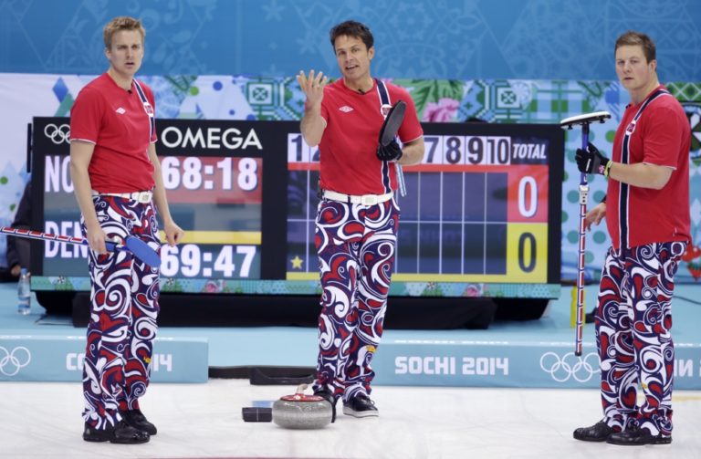 Nórski reprezentanti v curlingu počas pondelňajšieho zápasu na olympijskom turnaji proti Dánsku. Foto: SITA/AP
