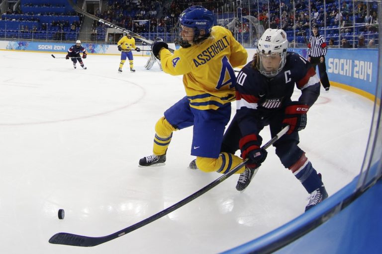 Švédska reprezentantka Jenni Asserholtová v súboji s Američankou Meghan Dugganovou počas pondelňajšieho semifinálového zápasu na olympijskom turnaji v Soči. Foto: SITA/AP