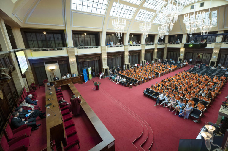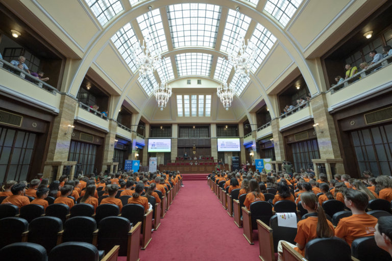 Atmosféra počas slávnostnej imatrikulácie študentov 22. ročníka Detskej Univerzity Komenského (UK) 2024 v Aule UK. Bratislava, 3. júl 2024. Foto: SITA/Milan Illík
