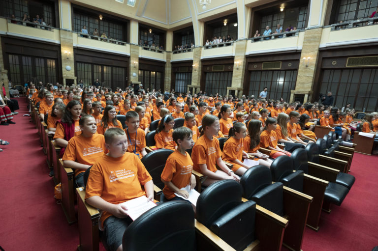 Študenti počas slávnostnej imatrikulácie študentov 22. ročníka Detskej Univerzity Komenského (UK) 2024 v Aule UK. Bratislava, 3. júl 2024. Foto: SITA/Milan Illík