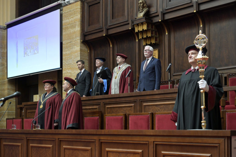 Sprava v pozadí: Riaditeľ Ústavu anorganickej chémie Slovenskej akadémie vied (SAV) Pavol Šajgalík, rektor Univerzity Komenského Marek Števček a riaditeľ divadla Aréna Juraj Kukura počas slávnostnej imatrikulácie študentov 22. ročníka Detskej Univerzity Komenského (UK) 2024 v Aule UK. Bratislava, 3. júl 2024. Foto: SITA/Milan Illík