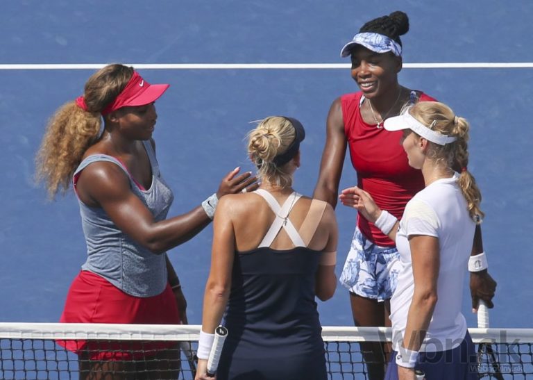 Serena a Venus Williamsové (vzadu) prehrali vo štvrťfinále štvorhry US Open s Ruskami Jekaterinou Makarovovou a Jelenou Vesninovou 6:7 (5), 4:6. Foto: SITA/AP