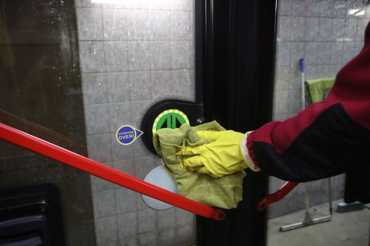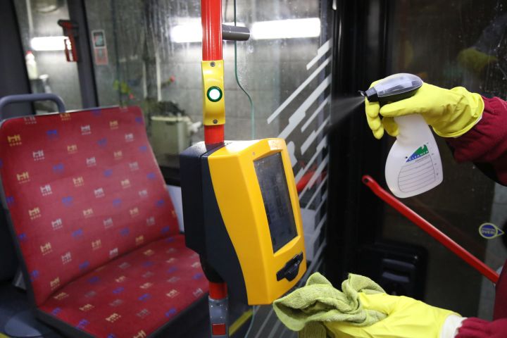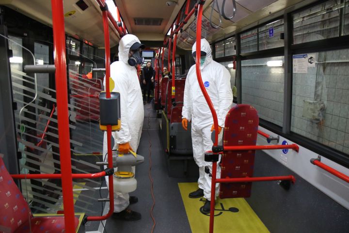 Dezinfekcia mestskej hromadnej dopravy (MHD), vykonaná metódou zahmlievania aerosolovým generátorom s použitím dezinfekčného prostriedku s obsahom nanočastíc striebra počas preventívneho opatrenia voči riziku nákazy novým koronavírusom (2019-nCoV) v bratislavskej vozovni Jurajov dvor Dopravného podniku Bratislava (DPB). Foto: SITA/Alexandra Čunderlíková