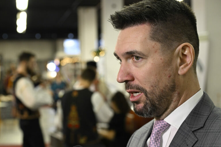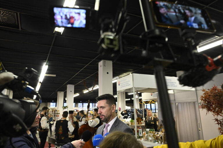 Minister pôdohospodárstva a rozvoja vidieka (MPRV) SR Richard Takáč (v popredí) počas brífingu ministra pôdohospodárstva a rozvoja vidieka SR Richarda Takáča s novinármi v stánku MPRV SR v rámci vianočného veľtrhu Dni Vianoc v Inchebe. Bratislava, 13. december 2024. Foto: SITA/Milan Illík