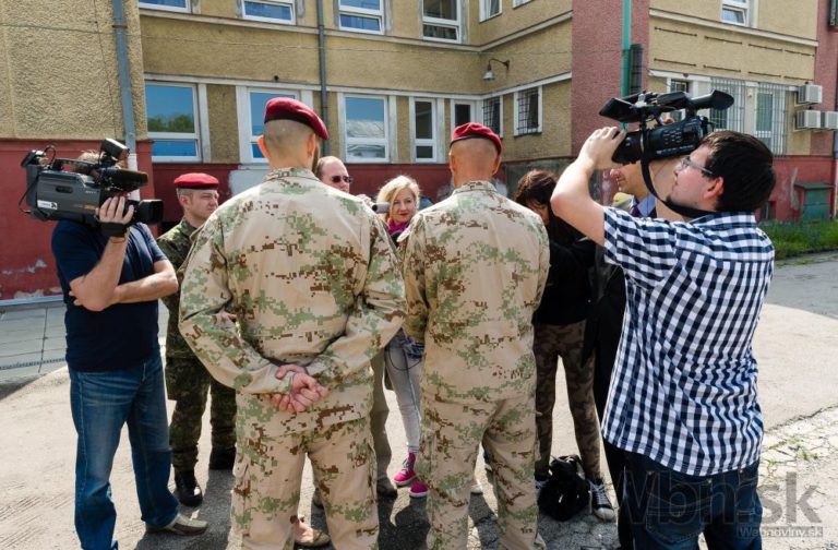 Druhý zástupca náčelníka Generálneho štábu OS SR generálmajor Pavel Macko (vpravo) odpovedá na otázky novinárov po slávnostnom nástupe príslušníkov 5. pluku špeciálneho určenia odchádzajúcich plniť úlohy do operácie ISAF v Afganistane. Žilina, 6. jún 2014. Foto: SITA/Milo Fabian