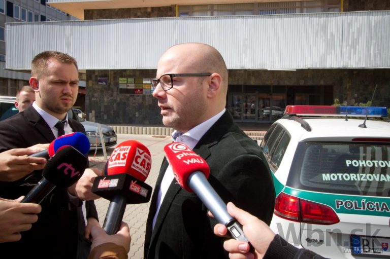 Hovorca spoločnosti Váhostav Tomáš Halán (vpravo hore) počas brífingu k zásahu polície v sídle spoločnosti. V budovách stavebnej firmy Váhostav zasahovali v stredu policajti, odniesli si dokumenty. Národná kriminálna agentúra (NAKA) začala v prípade spoločnosti trestné stíhanie vo veci poškodzovania veriteľa. Bratislava, 22. apríl 2015. Foto: SITA/Ľudovít Vaniher
