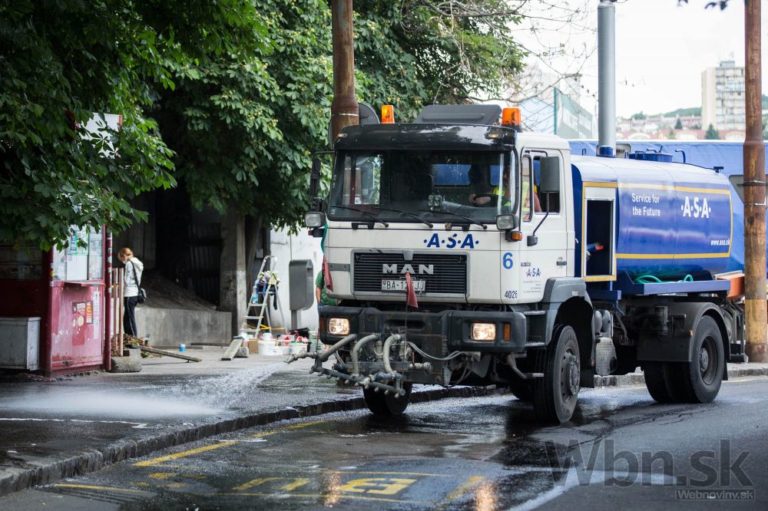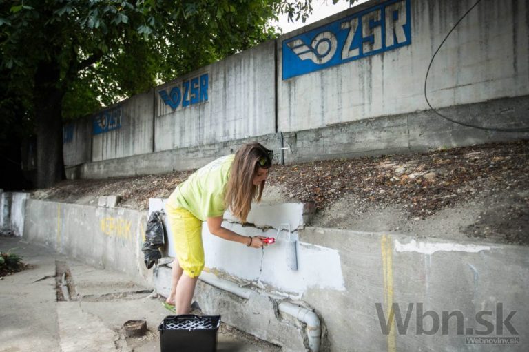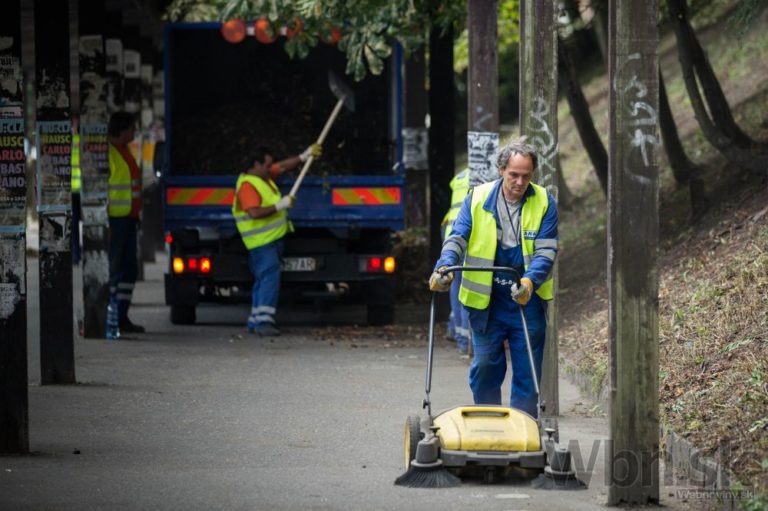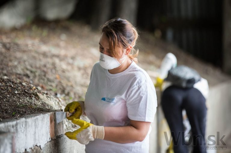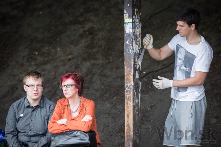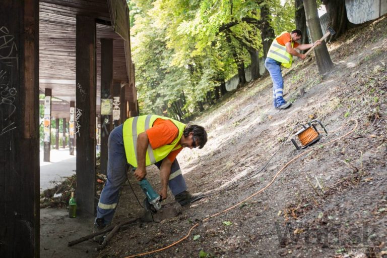 Zamestnanci spoločnosti A. R. K. technické služby a dobrovoľníci upratujú okolie Hlavnej železničnej stanice v rámci projektu Spolu pre čistú stanicu. Bratislava, 21. jún 2014. Foto: SITA/Jozef Jakubčo