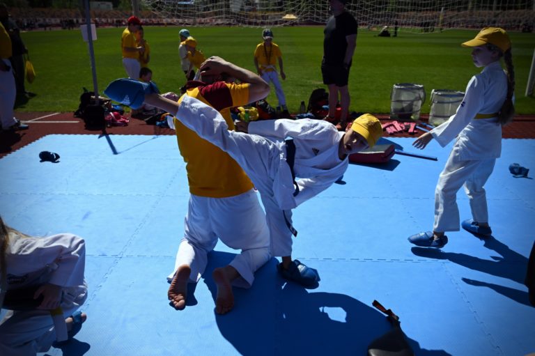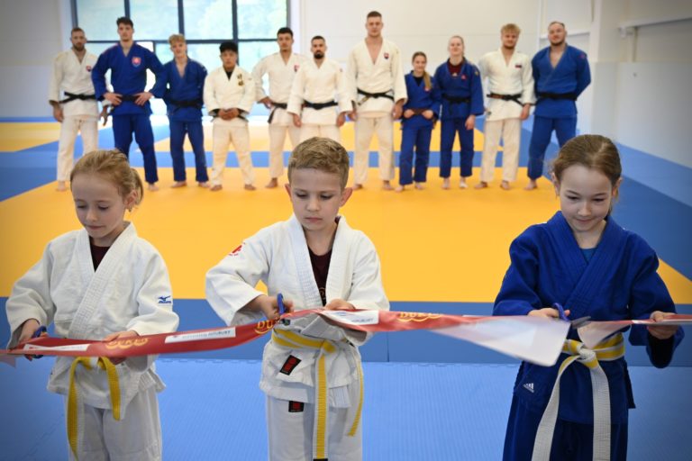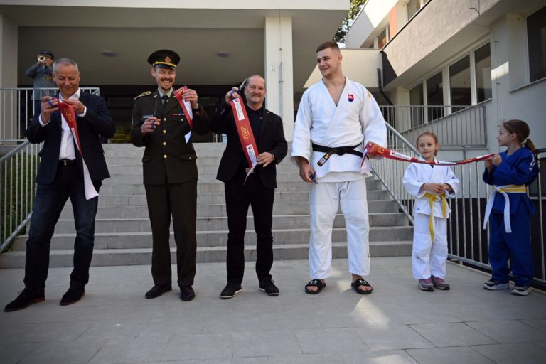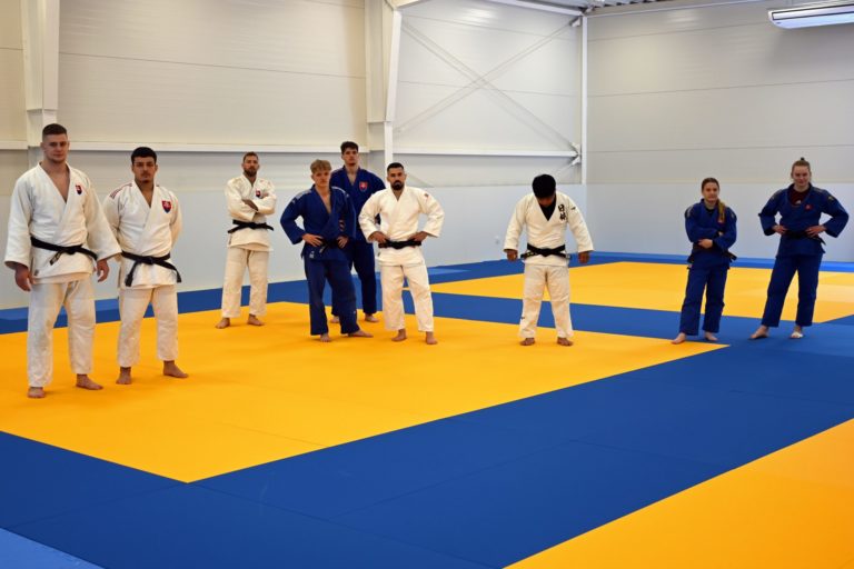 Džudisti Vojenského športového centra Dukla Banská Bystrica počas otvorenia tréningovo-diagnostického bloku v rámci Dňa otvorených dverí vo Vojenskom športovom centre Dukla Banská Bystrica. Banská Bystrica, 1. máj 2024. Foto: SITA/Jakub Julény