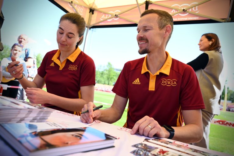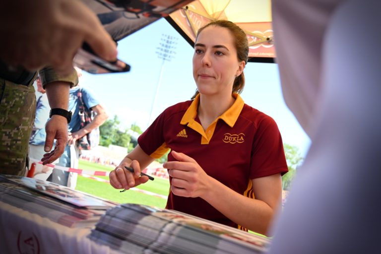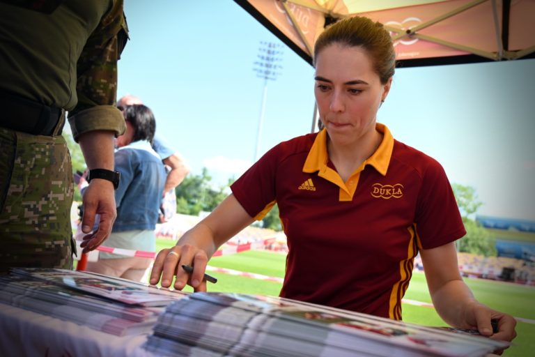 Zľava: Lyžiarka Petra Vlhová a chodec Matej Tóth počas autogramiády v rámci Dňa otvorených dverí vo Vojenskom športovom centre Dukla Banská Bystrica. Banská Bystrica, 1. máj 2024. Foto: SITA/Jakub Julény