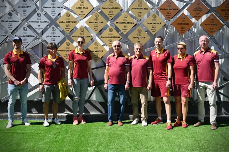 Zľava: Slovenskí úspešní olympionici - kajakár Jakub Grigar, vodný slalomár Michal Martikán, lyžiarka Petra Vlhová, futbalista František Kunzo, chodec Jozef Pribilinec, chodec Matej Tóth, vodná slalomárka Elena Kaliská a strelec Jozef Gönci počas odhalenie steny olympijských medailistov v rámci Dňa otvorených dverí vo Vojenskom športovom centre Dukla Banská Bystrica. Banská Bystrica, 1. máj 2024. Foto: SITA/Jakub Julény
