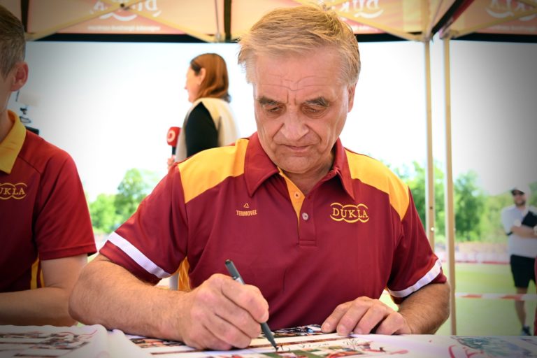 Bývalý chodec Jozef Pribilinec počas autogramiády v rámci Dňa otvorených dverí vo Vojenskom športovom centre Dukla Banská Bystrica. Banská Bystrica, 1. máj 2024. Foto: SITA/Jakub Julény