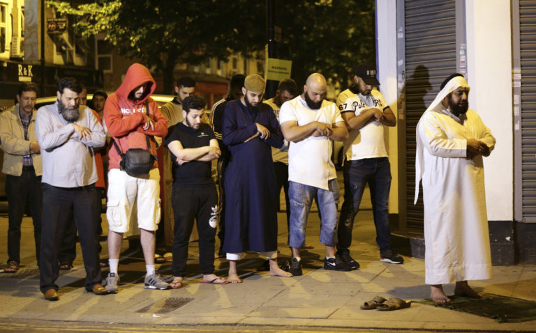 Ľudia sa modlia za obeť útoku pri mešite v londýnskom Finsbury Parku, kde dodávka vrazila do ľudí. Londýn, 19. jún 2017. Foto: Yui Mok/PA via AP
