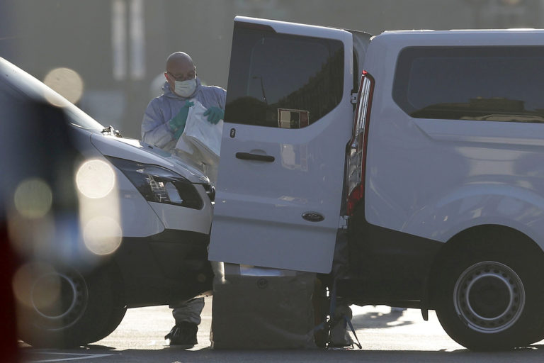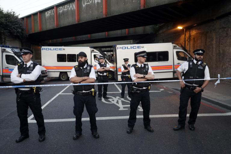 Hliadkujúci policajti neďaleko mešity v londýnskom Finsbury Parku, kde dodávka vrazila do ľudí. Londýn, 19. jún 2017. Foto: Victoria Jones/PA via AP.
