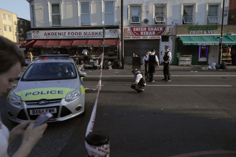 Policajti neďaleko mešity v londýnskom Finsbury Parku, kde dodávka vrazila do ľudí. Londýn, 19. jún 2017. Foto: Victoria Jones/PA via AP.