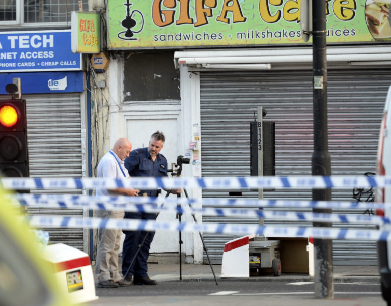 Hliadkujúci policajti neďaleko mešity v londýnskom Finsbury Parku, kde dodávka vrazila do ľudí. Londýn, 19. jún 2017. Foto: Yui Mok/PA via AP