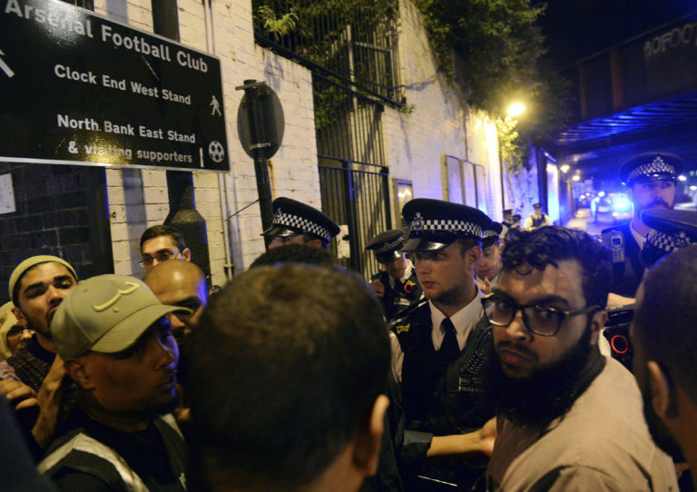 Hliadkujúci policajti neďaleko mešity v londýnskom Finsbury Parku, kde dodávka vrazila do ľudí. Londýn, 19. jún 2017. Foto: Yui Mok/PA via AP.
