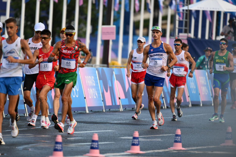 Slovenský atlét Dominik Černý (vpravo) počas pretekov na 20 km chôdza muži v rámci XXXIII. letných olympijských hier 2024 v Paríži. Paríž, 1. august 2024. Foto: SITA/Martin Medňanský