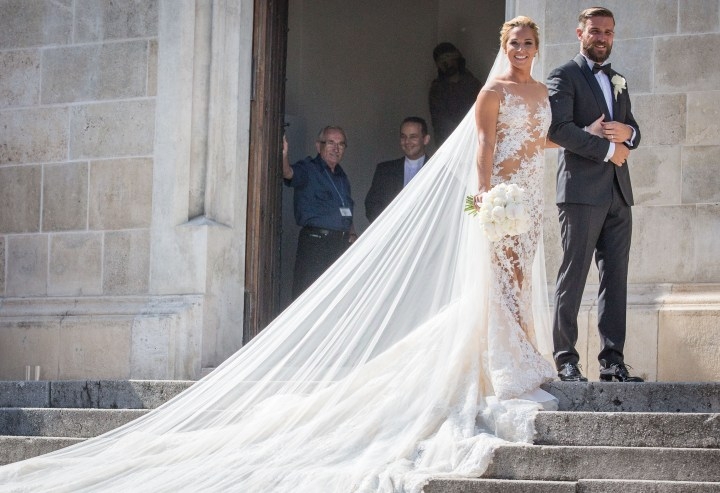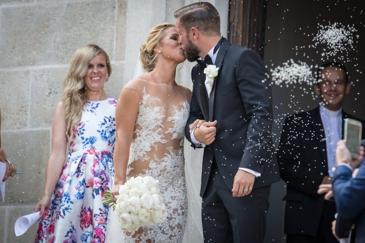 Sprava: Ženích a manžel tenistky Dominiky Cibulkovej Michal Navara a tenistka Dominika Navarová Cibulková po svadobnom obrade v Dóme svätého Martina. Bratislava, 9. júl 2016. Foto: SITA/Marko Erd