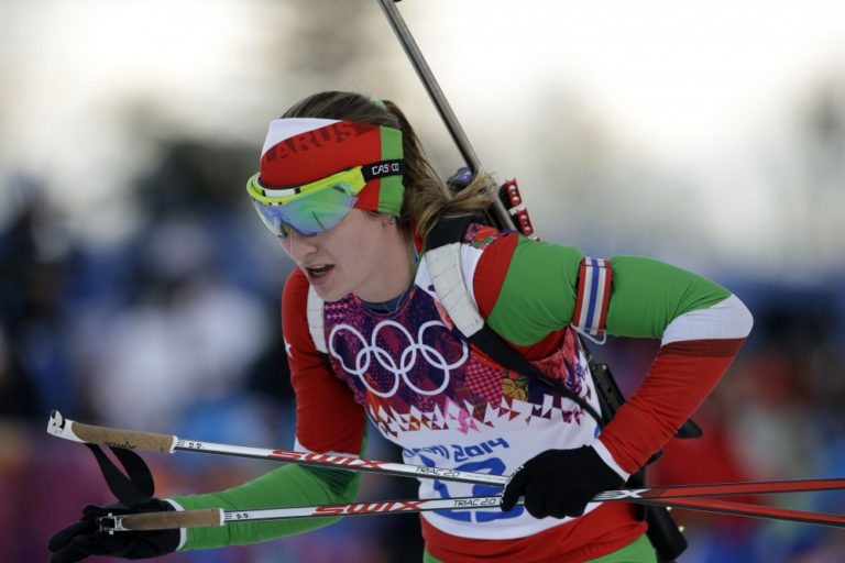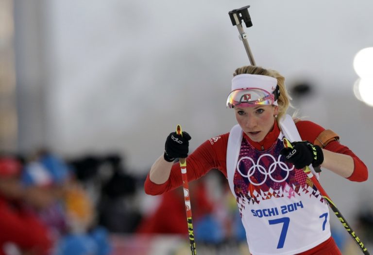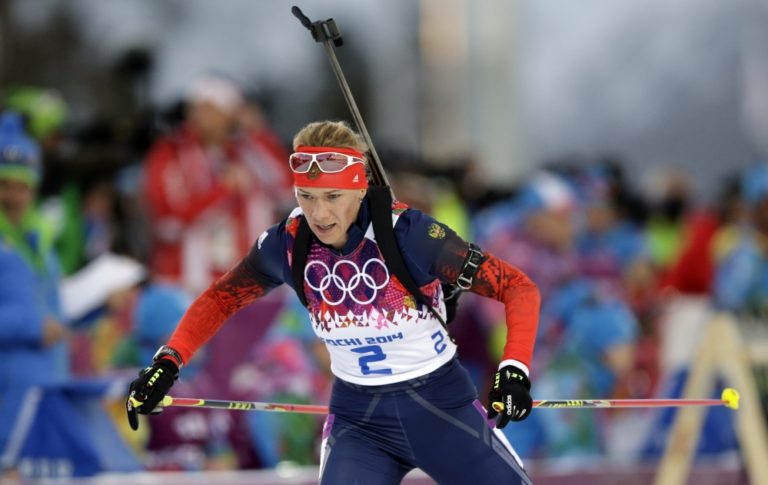 Bieloruská biatlonistka Daria Domračevová počas vytrvalostných pretekov žien na 15 km. Rusko, Soči, 14. februára 2014. Foto: SITA/AP