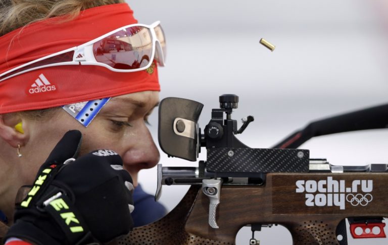 Ruská biatlonistka Oľga Zajcevová počas vytrvalostných pretekov žien na 15 km. Rusko, Soči, 14. februára 2014. Foto: SITA/AP