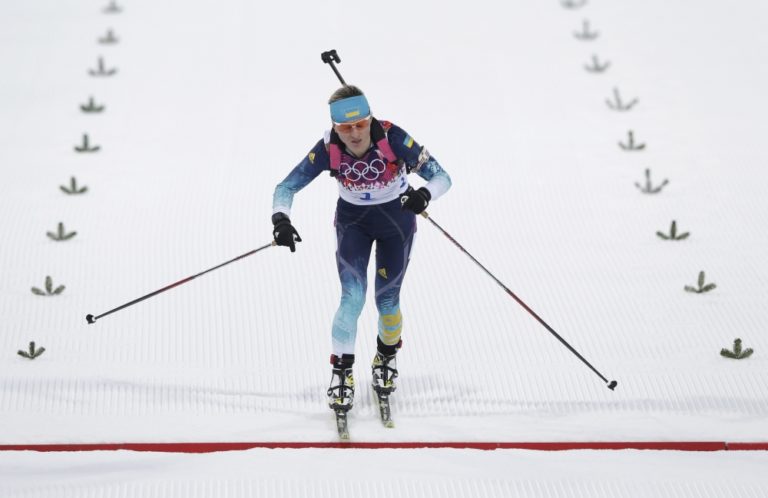 Ukrajinská biatlonistka Valj Semerenková v cieli vytrvalostných pretekov žien na 15 km. Rusko, Soči, 14. februára 2014. Foto: SITA/AP