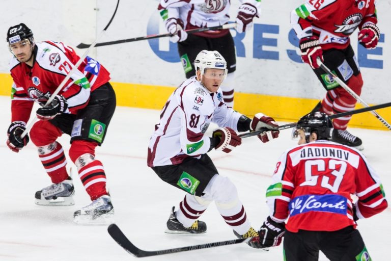 Hráč Dinama Marcel Hossa (uprostred) počas zápasu štvrťfinále Západnej konferencie Kontinentálnej hokejovej ligy (KHL) medzi Donbas Doneck a Dinamo Riga. Bratislava, 17. marec 2014. Foto: SITA/Jozef Jakubčo