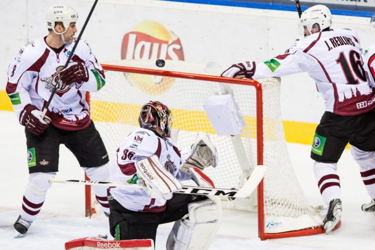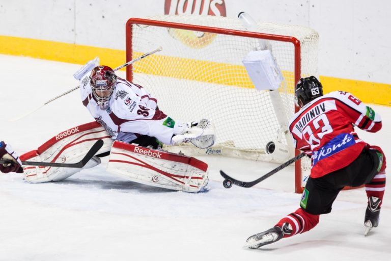 Sprava: Brankár Donbasu Ján Laco (vľavo) počas zápasu štvrťfinále Západnej konferencie Kontinentálnej hokejovej ligy (KHL) medzi Donbas Doneck a Dinamo Riga. Bratislava, 17. marec 2014. Foto: SITA/Jozef Jakubčo