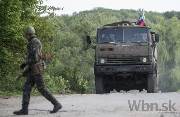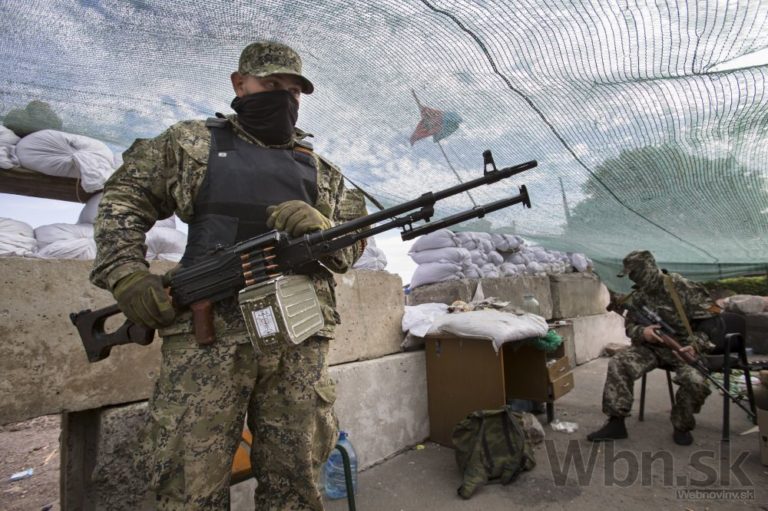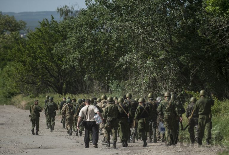 Proruskí miestni rezidenti kráčajú na svoje pozície počas bojov v Luhanskej oblasti. Pri ozbrojených stretoch neďaleko Donecku prišlo o život až sedemnásť ukrajinských vojakov. Mnohí ďalší utrpeli zranenia. Strety zaznamenali aj v susednej Luhanskej oblasti, obete na životoch však zatiaľ nehlásia. Foto: SITA/AP