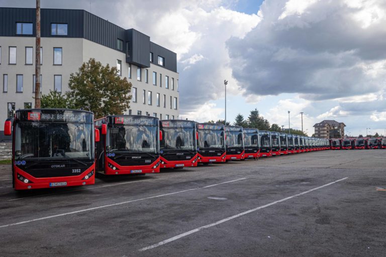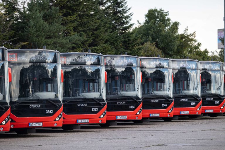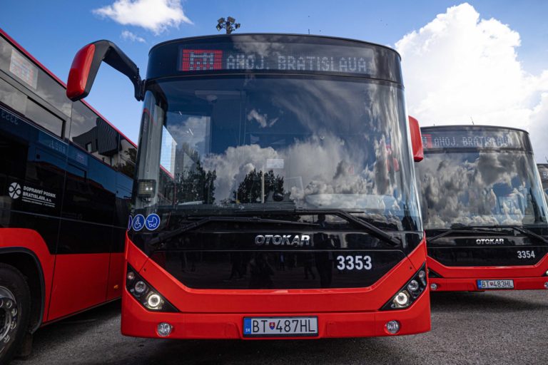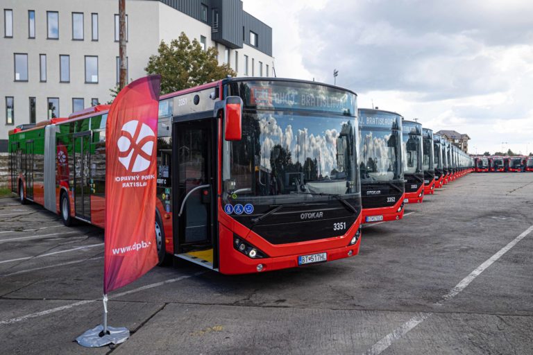 Nové kĺbové autobusy vo vozovni Jurajov dvor počas tlačového brífingu primátora Bratislavy a Dopravného podniku Bratislava (DPB). Foto: SITA/Jana Birošová