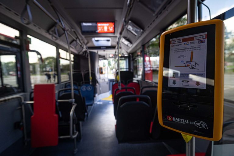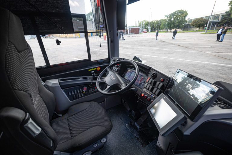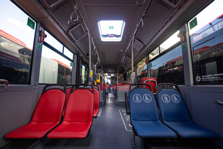 Interiér jedného z 31 nových kĺbových autobusov s najmodernejšou výbavou vo vozovni Jurajov dvor počas tlačového brífingu primátora Bratislavy a Dopravného podniku Bratislava (DPB), na ktorom ich predstavili. Bratislava, 21. september 2022. Foto: SITA/Jana Birošová