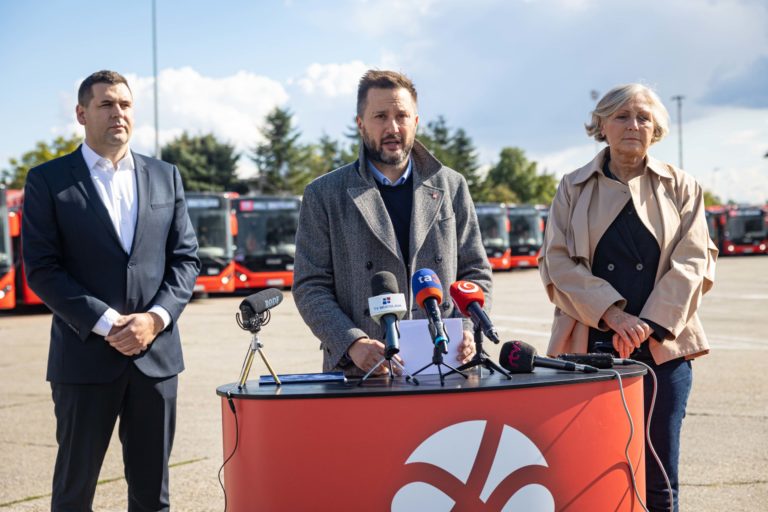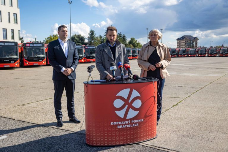 Sprava: Viceprimátorka Bratislavy Tatiana Kratochvílová, primátor Bratislavy Matúš Vallo a predseda predstavenstva DPB Martin Rybanský počas tlačového brífingu primátora Bratislavy Matúša Valla a Dopravného podniku Bratislava (DPB), na ktorom predstavili 31 nových kĺbových autobusov s najmodernejšou výbavou. Bratislava, 21. september 2022. Foto: SITA/Jana Birošová