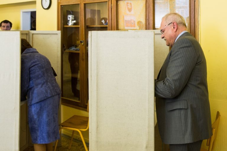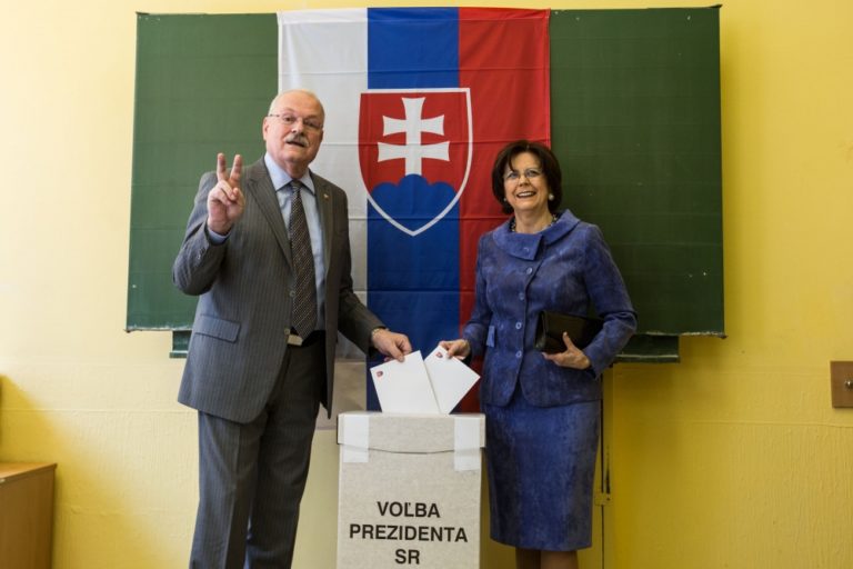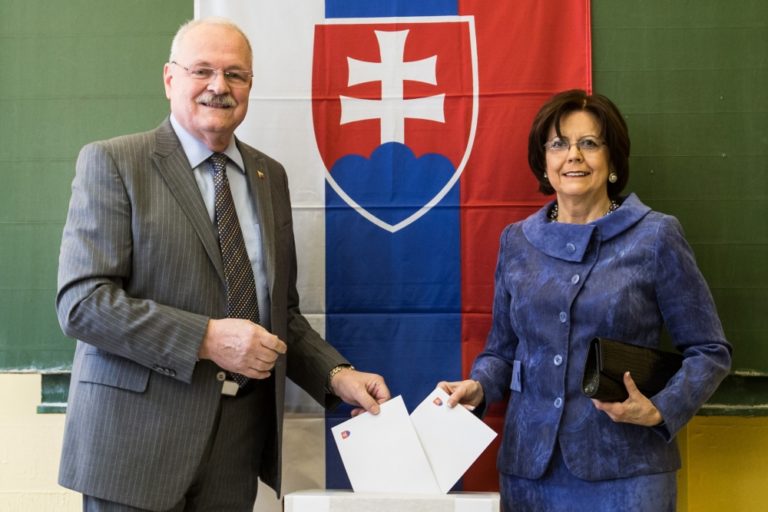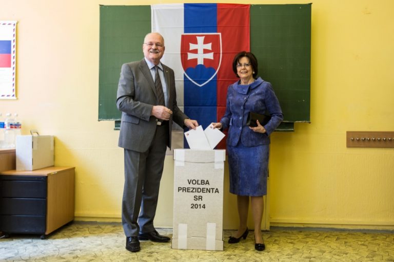 Zľava: Prezident SR Ivan Gašparovič s manželkou Silviou počas volebného aktu v rámci druhého kola voľby prezidenta Slovenskej republiky na ZŠ Jelačičova 5 v Bratislave. Bratislava, 29. marec 2014. Foto: SITA/Jozef Jakubčo