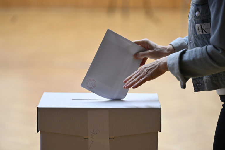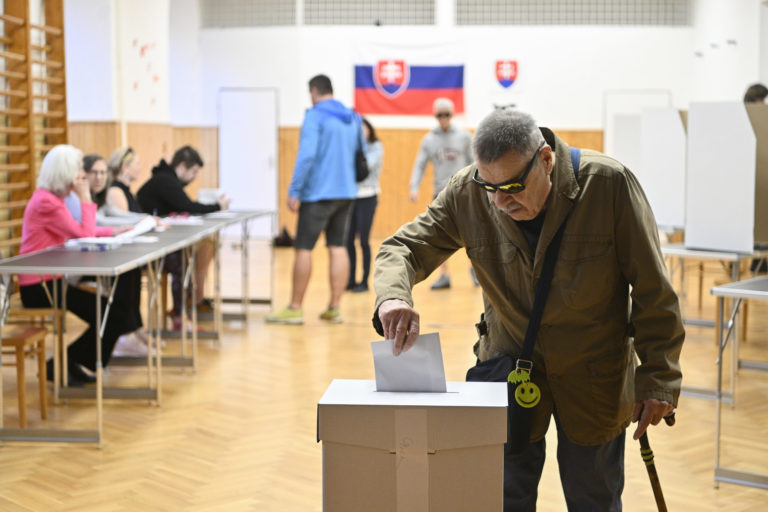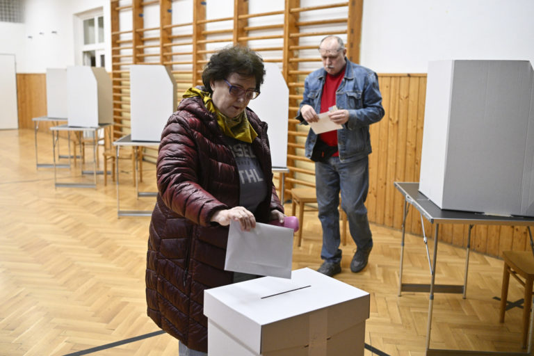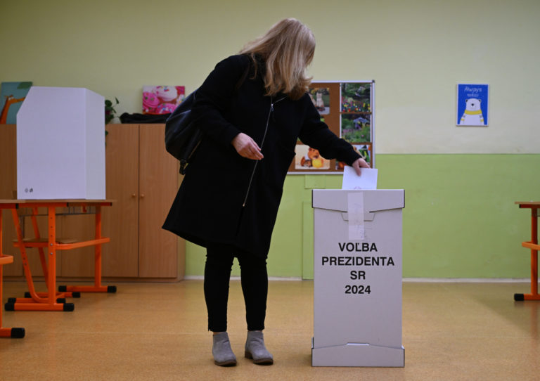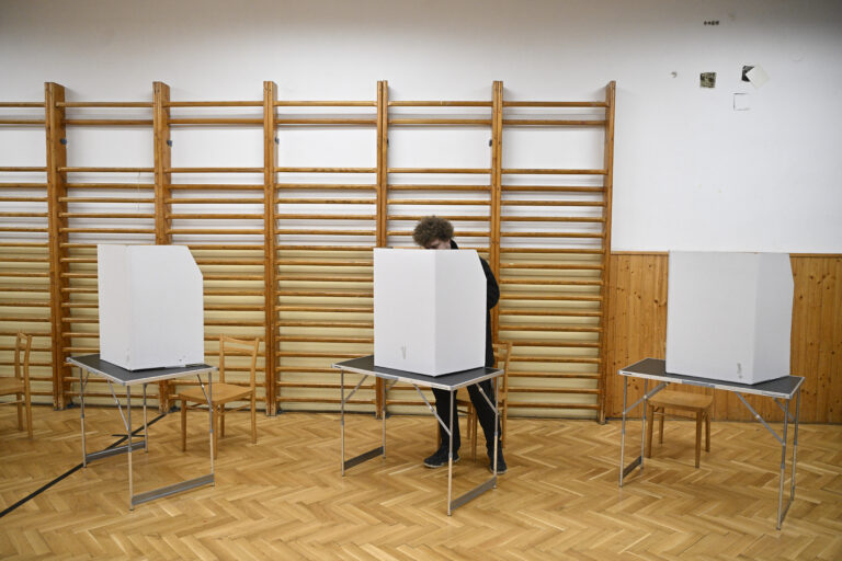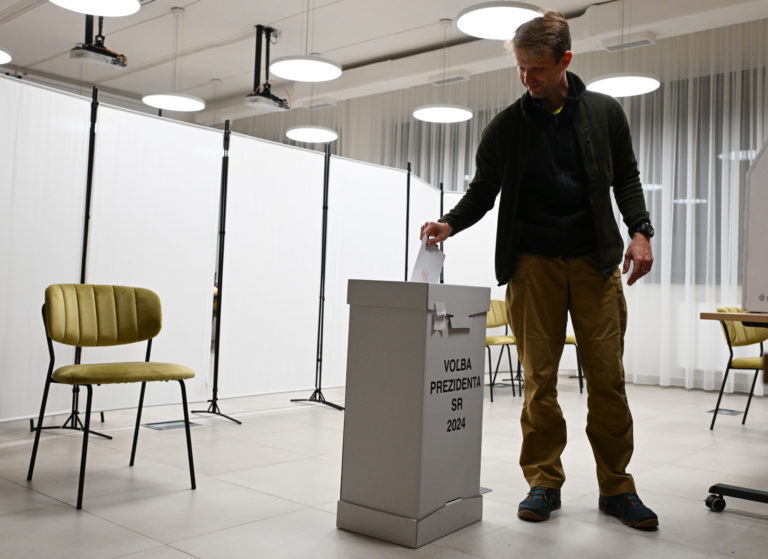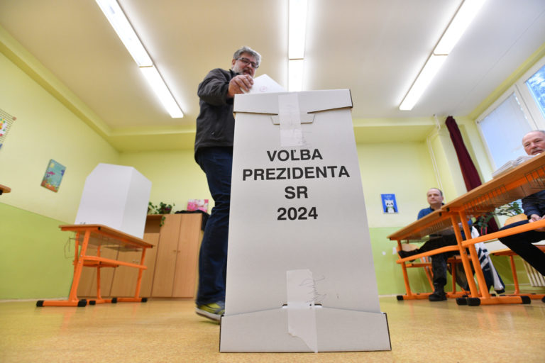 Volič vhadzuje do urny svoj hlas počas volebného aktu vo volebnej miestnosti v Bratislave v rámci 2. kola prezidentských volieb 2024. Bratislava, 6. apríl 2024. Foto: SITA/AP.
