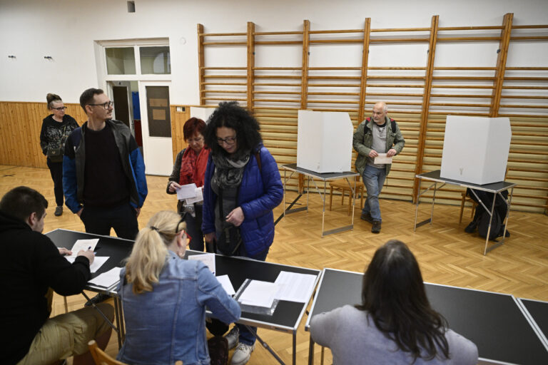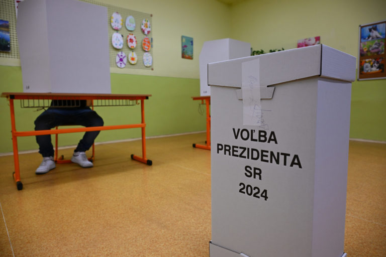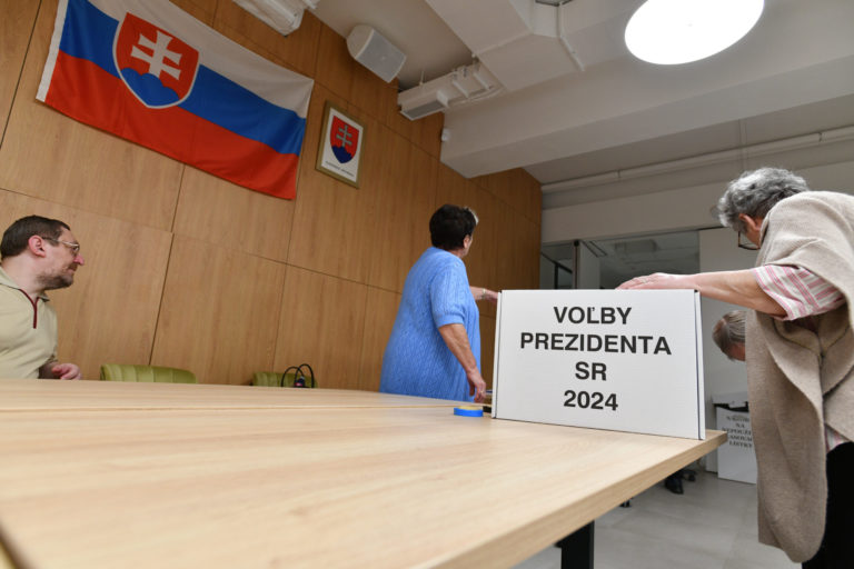 Priebeh volieb vo volebnej miestnosti v Bratislave počas 2. kola prezidentských volieb 2024. Bratislava, 6. apríl 2024. Foto: SITA/AP.