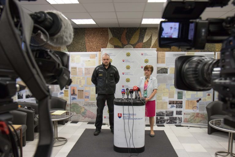 Zľava: Riaditeľ poriadkovej polície Prezídia Policajného zboru (PPZ) SR Stanislav Hromádka a riaditeľka odboru volieb, referenda a politických strán sekcie verejnej správy Ministerstva vnútra (MV) SR a zapisovateľka Štátnej komisie pre voľby a kontrolu financovania politických strán Eva Chmelová počas tlačovej konferencie Štátnej komisie pre voľby a kontrolu financovania politických strán v rámci 2. kola prezidentských volieb 2024. Bratislava, 6. apríl 2024. Foto: SITA/Ľudovít Vaniher.