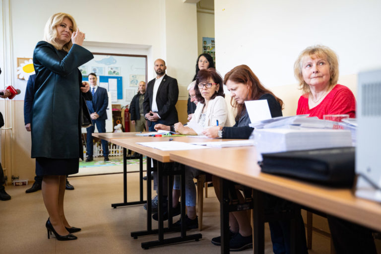 Prezidentka SR Zuzana Čaputová (v popredí vľavo) počas volebného aktu v rámci 2. kola prezidentských volieb 2024. Pezinok, 6. apríl 2024. Foto: SITA/Jana Birošová