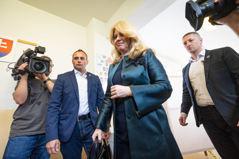 Prezidentka SR Zuzana Čaputová (v popredí) počas brífingu po volebnom akte v rámci 2. kola prezidentských volieb 2024. Pezinok, 6. apríl 2024. Foto: SITA/Jana Birošová