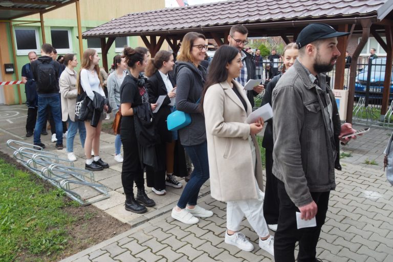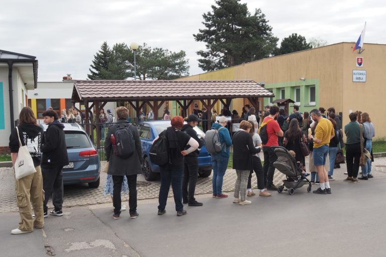 Slovenskí voliči z Českej republiky pred volebnými miestnosťami v Kútoch na Záhorí počas volebného aktu v rámci 2. kola prezidentských volieb 2024. Kúty, 6. apríl 2024. Foto: SITA/Pavol Machovič