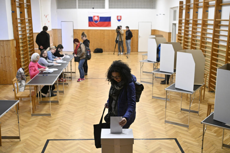 Volička vhadzuje do urny svoj hlas počas volebného aktu vo volebnej miestnosti v Bratislave v rámci 2. kola prezidentských volieb 2024. Bratislava, 6. apríl 2024. Foto: SITA/AP.